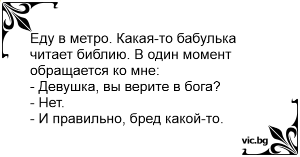 Еду в метро. Какая-то бабулька читает библию. В один момент обращается ко мне: