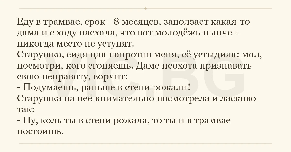 - Ну, коль ты в степи рожала, то ты и в трамвае постоишь.