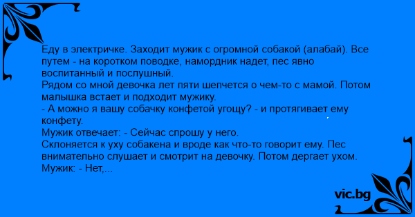 Еду в электричке. Заходит мужик с огромной собакой (алабай). Все путем - на коротком поводке, намордник надет, пес явно воспитанный и послушный. Рядом со мной девочка лет пяти шепчется о чем-то с мамой. Потом малышка встает и подходит мужику. - А можно я вашу собачку конфетой угощу? - и протягивает ему конфету. Мужик отвечает: - Сейчас спрошу у него. Склоняется к уху собакена и вроде как что-то говорит ему. Пес внимательно слушает и смотрит на девочку. Потом дергает ухом. Мужик: - Нет, не будет есть. Сказал - слишком маленькая для него. Девочка кивает, возвращается обратно задумчивая. Слышу, через пару минут спрашивает у мамы: - Слишком маленькая кто? Я или конфета?