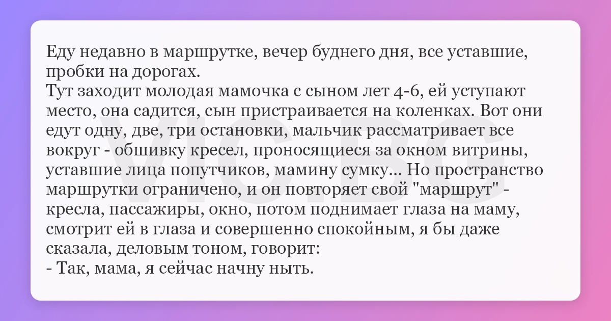 Тут заходит молодая мамочка с сыном лет 4-6, ей уступают место, она садится, сын пристраивается на коленках. Вот они едут одну, две, три остановки, мальчик рассматривает все вокруг - обшивку кресел, проносящиеся за окном витрины, уставшие лица попутчиков, мамину сумку... Но пространство маршрутки ограничено, и он повторяет свой "маршрут" - кресла, пассажиры, окно, потом поднимает глаза на маму, смотрит ей в глаза и совершенно спокойным, я бы даже сказала, деловым тоном, говорит: