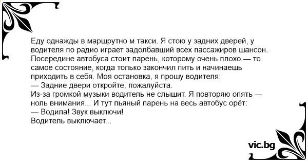 Из-за громкой музыки водитель не слышит. Я повторяю опять — ноль внимания... И тут пьяный парень на весь автобус орёт: