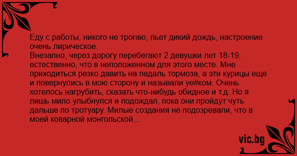 Внезапно, через дорогу перебегают 2 девушки лет 18-19, естественно, что в неположенном для этого месте. Мне приходиться резко давить на педаль тормоза, а эти курицы еще и повернулись в мою сторону и называли уе#ком. Очень хотелось нагрубить, сказать что-нибудь обидное и т.д. Но я лишь мило улыбнулся и подождал, пока они пройдут чуть дальше по тротуару. Милые создания не подозревали, что в моей коварной монгольской голове зародился план мести, ведь я увидел невероятно огромную лужу. Дальше - дело техники: подождать, когда жертвы поравняются с этой лужей и нажать на газ до отказа.