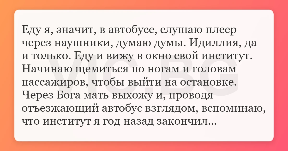 Еду я, значит, в автобусе, слушаю плеер через наушники, думаю думы. Идиллия, да и только. Еду и вижу в окно свой институт. Начинаю щемиться по ногам и головам пассажиров, чтобы выйти на остановке. Через Бога мать выхожу и, проводя отъезжающий автобус взглядом, вспоминаю, что институт я год назад закончил...