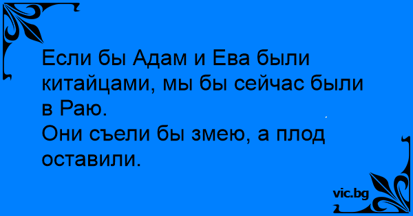 Ако Адам и Ева бяха китайци, сега щяхме да сме в рая още. Те биха изяли змията, вместо ябълката