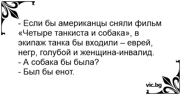 - Если бы американцы сняли фильм «Четыре танкиста и собака», в экипаж танка бы входили – еврей, нeгp, голубой и женщина-инвалид.