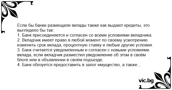 3. Банк считается уведомленным и согласен с новыми условиями вклада, если вкладчик разместил уведомление об этом в своём блоге или в объявлении в своём подъезде.