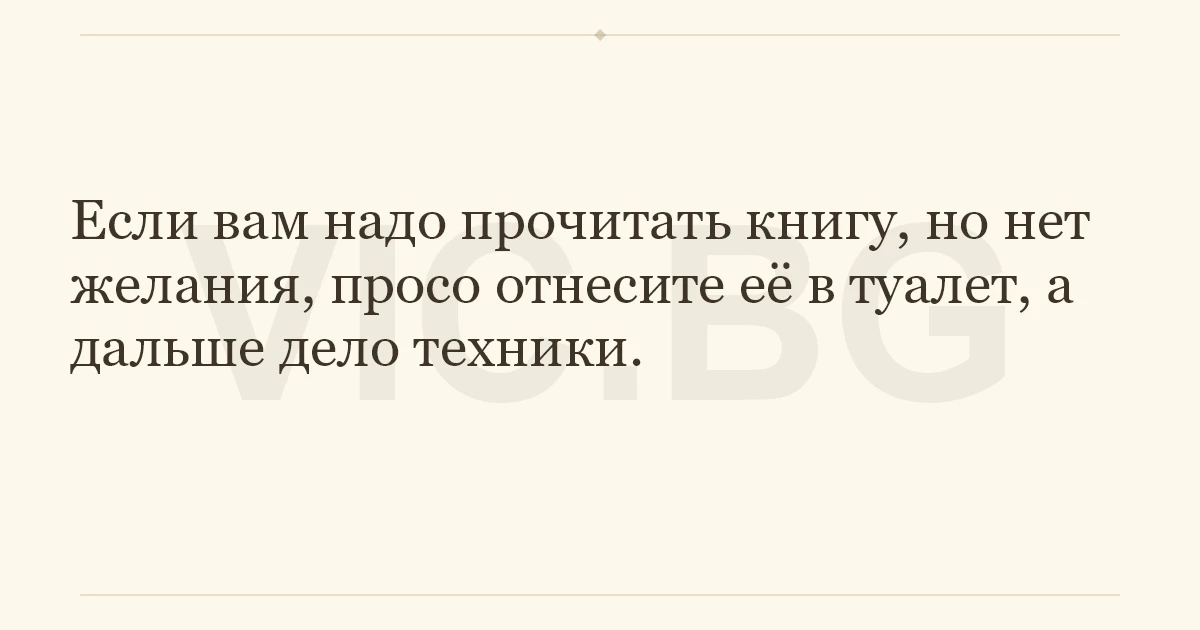 Если вам надо прочитать книгу, но нет желания, просо отнесите её в туалет, а дальше дело техники. 19 0 0 Анекдоты
