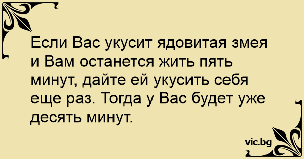 Если Вас укусит ядовитая змея и Вам останется жить пять минут, дайте ей укусить себя еще раз. Тогда у Вас будет уже десять минут.