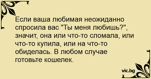 Если ваша любимая неожиданно спросила вас "Ты меня любишь?", значит, она или что-то сломала, или что-то купила, или на что-то обиделась. В любом случае готовьте кошелек.