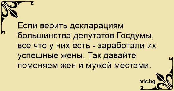 Если верить декларациям большинства депутатов Госдумы, все что у них есть - заработали их успешные жены. Так давайте поменяем жен и мужей местами.