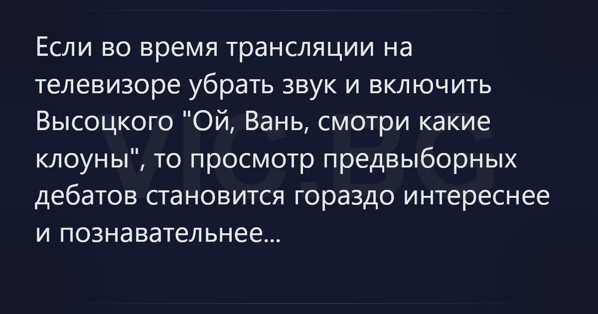 Если во время трансляции на телевизоре убрать звук и включить Высоцкого "Ой, Вань, смотри какие клоуны", то просмотр предвыборных дебатов становится гораздо интереснее и познавательнее...