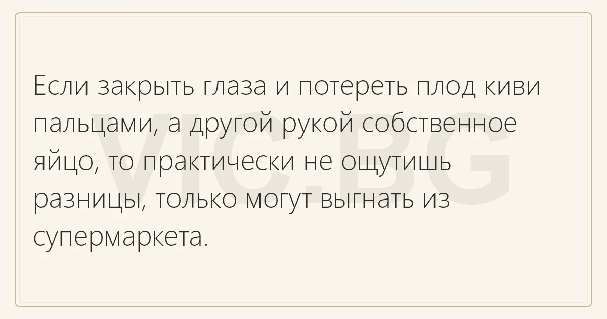 Если закрыть глаза и потереть плод киви пальцами, а другой рукой собственное яйцо, то практически не ощутишь разницы, только могут выгнать из супермаркета.