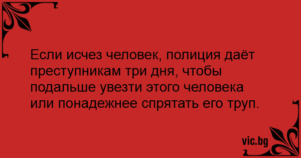 Если исчез человек, полиция даёт преступникам три дня, чтобы подальше увезти этого человека или понадежнее спрятать его труп.