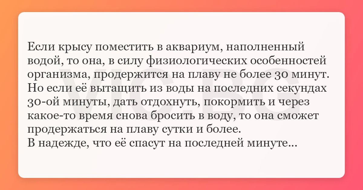 Если крысу поместить в аквариум, наполненный водой, то она, в силу физиологических особенностей организма, продержится на плаву не более 30 минут. Но если её вытащить из воды на последних секундах 30-ой минуты, дать отдохнуть, покормить и через какое-то время снова бросить в воду, то она сможет продержаться на плаву сутки и более. В надежде, что её спасут на последней минуте...