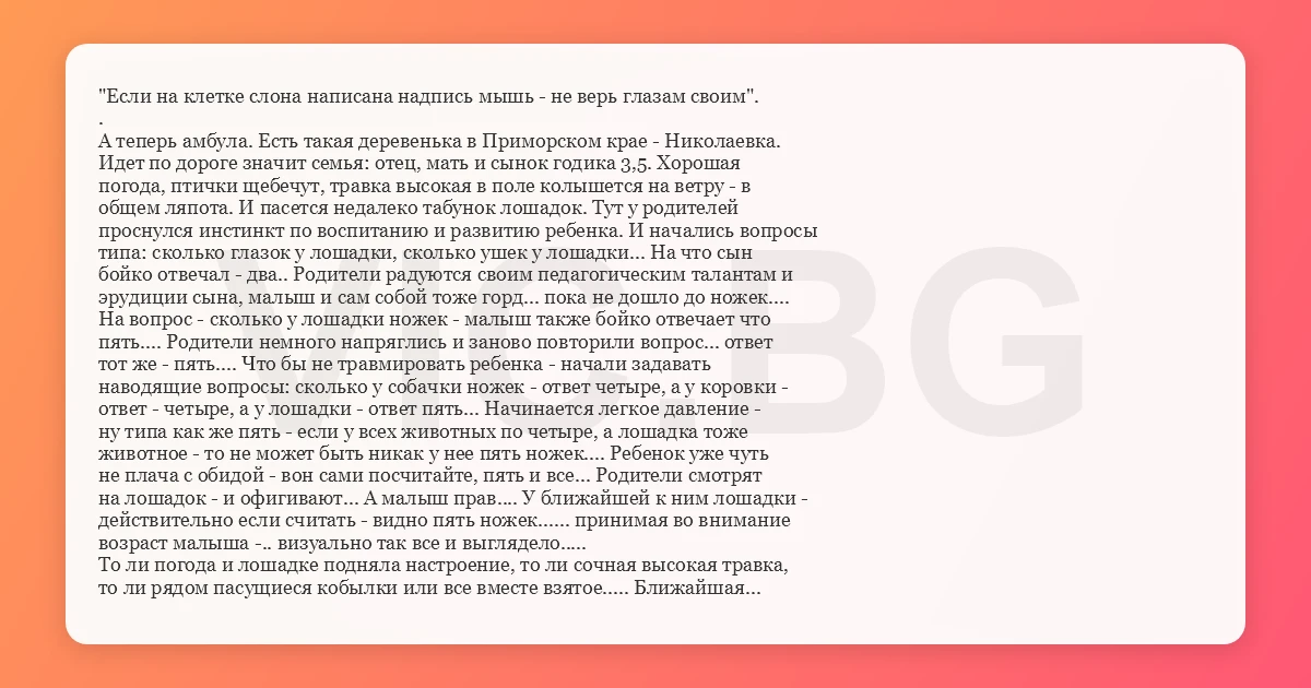"Если на клетке слона написана надпись мышь - не верь глазам своим". . А теперь амбула. Есть такая деревенька в Приморском крае - Николаевка. Идет по дороге значит семья: отец, мать и сынок годика 3,5. Хорошая погода, птички щебечут, травка высокая в поле колышется на ветру - в общем ляпота. И пасется недалеко табунок лошадок. Тут у родителей проснулся инстинкт по воспитанию и развитию ребенка. И начались вопросы типа: сколько глазок у лошадки, сколько ушек у лошадки... На что сын бойко отвечал - два.. Родители радуются своим педагогическим талантам и эрудиции сына, малыш и сам собой тоже горд... пока не дошло до ножек.... На вопрос - сколько у лошадки ножек - малыш также бойко отвечает что пять.... Родители немного напряглись и заново повторили вопрос... ответ тот же - пять.... Что бы не травмировать ребенка - начали задавать наводящие вопросы: сколько у собачки ножек - ответ четыре, а у коровки - ответ - четыре, а у лошадки - ответ пять... Начинается легкое давление - ну типа как же пять - если у всех животных по четыре, а лошадка тоже животное - то не может быть никак у нее пять ножек.... Ребенок уже чуть не плача с обидой - вон сами посчитайте, пять и все... Родители смотрят на лошадок - и офигивают... А малыш прав.... У ближайшей к ним лошадки - действительно если считать - видно пять ножек...... принимая во внимание возраст малыша -.. визуально так все и выглядело..... То ли погода и лошадке подняла настроение, то ли сочная высокая травка, то ли рядом пасущиеся кобылки или все вместе взятое..... Ближайшая лошадка - мальчиком оказалась... ну и природа наделила их там щедро... вот и малыш насчитал пятую ножку - травка та высокая и где она (ножка пятая) там заканчивается не видно......