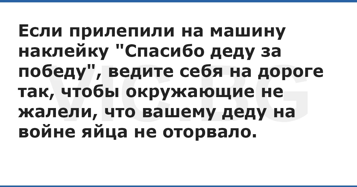 Если прилепили на машину наклейку "Спасибо деду за победу", ведите себя на дороге так, чтобы окружающие не жалели, что вашему деду на войне яйца не оторвало.