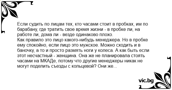 Как правило это лицо какого-нибудь менеджера. Но в пробке ему спокойно, если лицо это мужское. Можно сходить и в баночку, а то и просто размять ноги у колеса. А как быть если этот несчастный - женщина. Она же не планировала стоять часами на МКАДе, потому что другие менеджеры никак не могут поделить съезды с кольцевой? Они же МЕНЕДЖЕРЫ, в очереди на съезд стоят только лохи. Вот и мучается бедная - не присядешь же в мороз у колеса КАМАЗА. Наблюдал я такую несчастную в мрачной слабодвигающейся толпе машин на МКАДе. Прыгала она прыгала на месте, пока не выдержала и не помчалась к ближайшему техцентру известной марки, двери стеклянные, все видно. А там охранник, руки растопырил - не положено де, закрыто. Щазз - девочка 40 кг весом за ручку о землю охранника хрясь, и лежит красавец, а та уже заперлась в кабинете. Вышла довольная, что-то сказала охраннику, уже сидящему на полу и не торопясь пошла к своему красненькому Гетцу. Не одна она была такая, еще пара женщин трусцой посеменили ко входу. Охранник - теперь ученый, только и махнул рукой им - туда дамочки, туда. Такая вот половая история.