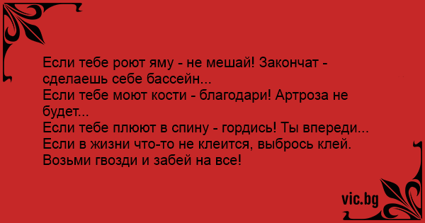 Если тебе роют яму - не мешай! Закончат - сделаешь себе бассейн... Если тебе моют кости - благодари! Артроза не будет... Если тебе плюют в спину - гордись! Ты впереди... Если в жизни что-то не клеится, выбрось клей. Возьми гвозди и забей на все!
