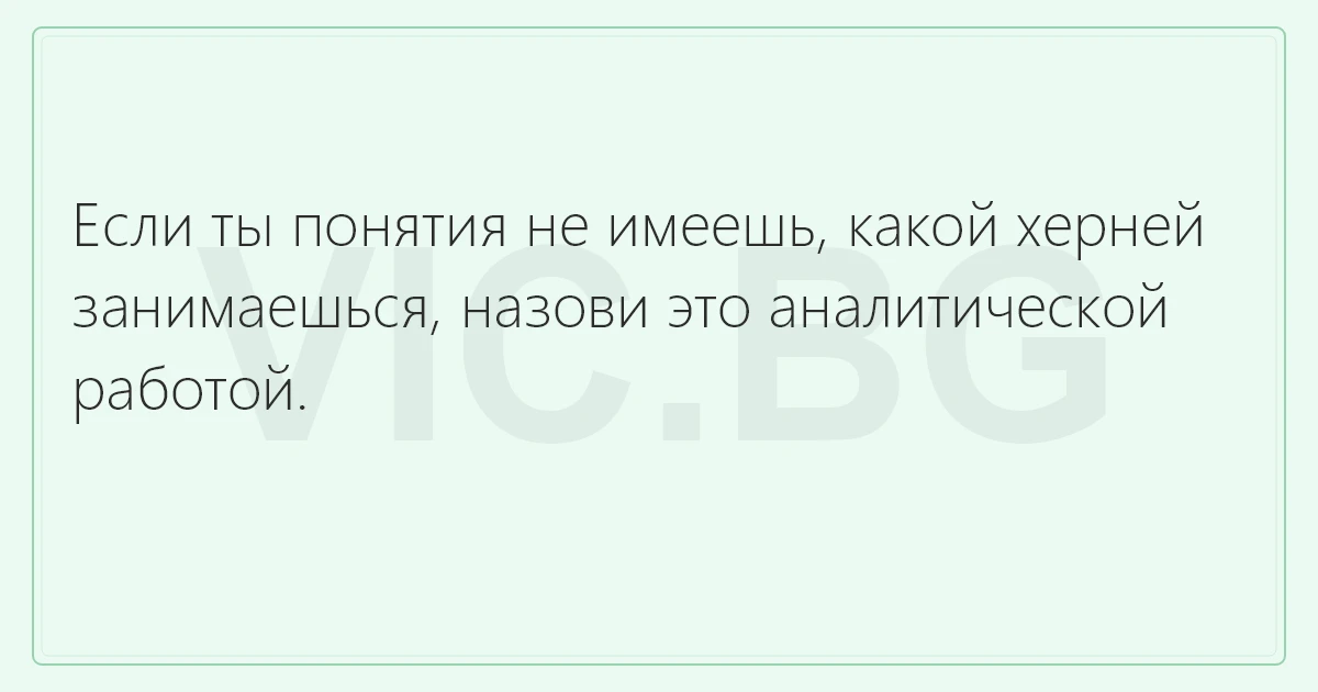 Если ты понятия не имеешь, какой херней занимаешься, назови это аналитической работой. 1 0 0 Анекдоты