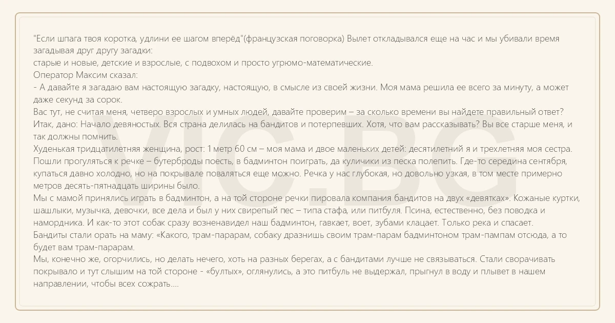 "Если шпага твоя коротка, удлини ее шагом вперёд"(французская поговорка) Вылет откладывался еще на час и мы убивали время загадывая друг другу загадки: старые и новые, детские и взрослые, с подвохом и просто угрюмо-математические. Оператор Максим сказал: - А давайте я загадаю вам настоящую загадку, настоящую, в смысле из своей жизни. Моя мама решила ее всего за минуту, а может даже секунд за сорок. Вас тут, не считая меня, четверо взрослых и умных людей, давайте проверим – за сколько времени вы найдете правильный ответ? Итак, дано: Начало девяностых. Вся страна делилась на бандитов и потерпевших. Хотя, что вам рассказывать? Вы все старше меня, и так должны помнить. Худенькая тридцатилетняя женщина, рост: 1 метр 60 см – моя мама и двое маленьких детей: десятилетний я и трехлетняя моя сестра. Пошли прогуляться к речке – бутерброды поесть, в бадминтон поиграть, да куличики из песка полепить. Где-то середина сентября, купаться давно холодно, но на покрывале поваляться еще можно. Речка у нас глубокая, но довольно узкая, в том месте примерно метров десять-пятнадцать ширины было. Мы с мамой принялись играть в бадминтон, а на той стороне речки пировала компания бандитов на двух «девятках». Кожаные куртки, шашлыки, музычка, девочки, все дела и был у них свирепый пес – типа стафа, или питбуля. Псина, естественно, без поводка и намордника. И как-то этот собак сразу возненавидел наш бадминтон, гавкает, воет, зубами клацает. Только река и спасает. Бандиты стали орать на маму: «Какого, трам-парарам, собаку дразнишь своим трам-парам бадминтоном трам-пампам отсюда, а то будет вам трам-парарам. Мы, конечно же, огорчились, но делать нечего, хоть на разных берегах, а с бандитами лучше не связываться. Стали сворачивать покрывало и тут слышим на той стороне - «бултых», оглянулись, а это питбуль не выдержал, прыгнул в воду и плывет в нашем направлении, чтобы всех сожрать. Бандиты сами испугались последствий, орут ему, но он не реагирует, а в холодную воду за питбулем хозяева тоже не спешат, дураков нет. Стали нам кричать: «Трам-парарам оттуда, пока время есть, может, успеете до леса добежать!» Вот такая задачка: вы четверо - мои мамы, к вам и вашим детям плывет зубастая торпеда-убийца, секунд через сорок, она уже будет здесь, а до леса метров триста. Решайте, время пошло. Кто-то из нас предложил бежать врассыпную, так гарантировано выживут двое из троих, кто-то отправить вперед детей и бежать позади них, чтобы детей уж точно спасти, кто-то, громко зарычать, оскалив зубы и встав на четвереньки. Я предложил намотать на руку покрывало, чтобы принять на него первый укус, а там видно будет. Когда идеи иссякли, Максим сделал паузу и сказал: - Все, вариантов больше нет? Если честно, с тех пор прошло лет двадцать пять, но я до сих пор удивляюсь - и как это моя мама за сорок секунд смогла додуматься до правильного ответа? Видимо, когда твоим детям грозит смертельная опасность, мозги с дежурного освещения резко переключаются на полную иллюминацию и сами собой выдают единственно-правильное решение. Мы даже с сестрой тогда подумали, что мама от страха с ума сошла. Она взяла бадминтонную ракетку и, как была в джинсах, так и вошла по пояс в воду, прямо навстречу плывущей смерти. Я орал: «Мама, ты что!? Бежим, Мама!» Когда питбуль подплыл к маме, она аккуратненько окунула его голову ракеткой. Подержала немно
