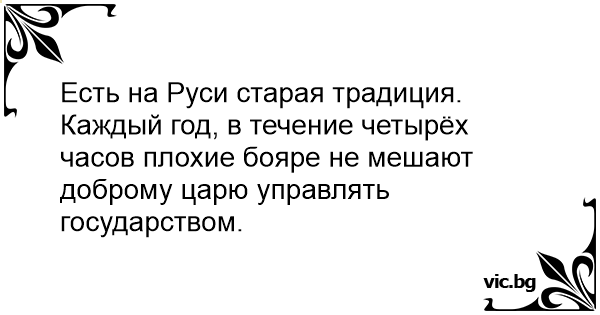 Есть на Руси старая традиция. Каждый год, в течение четырёх часов плохие бояре не мешают доброму царю управлять государством.
