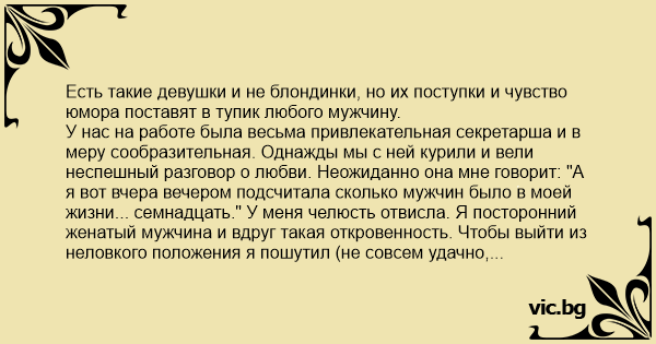У нас на работе была весьма привлекательная секретарша и в меру сообразительная. Однажды мы с ней курили и вели неспешный разговор о любви. Неожиданно она мне говорит: "А я вот вчера вечером подсчитала сколько мужчин было в моей жизни... семнадцать." У меня челюсть отвисла. Я посторонний женатый мужчина и вдруг такая откровенность. Чтобы выйти из неловкого положения я пошутил (не совсем удачно, но быстро)- "А я недавно вспоминал сколько у меня внебрачных детей... восемь." Мгновенно переменившись в лице девушка вскочила и презрительно бросила фразу - "Я думала ты порядочный, а ты распутник, которых свет не видывал." Две недели не разговаривала со мной.