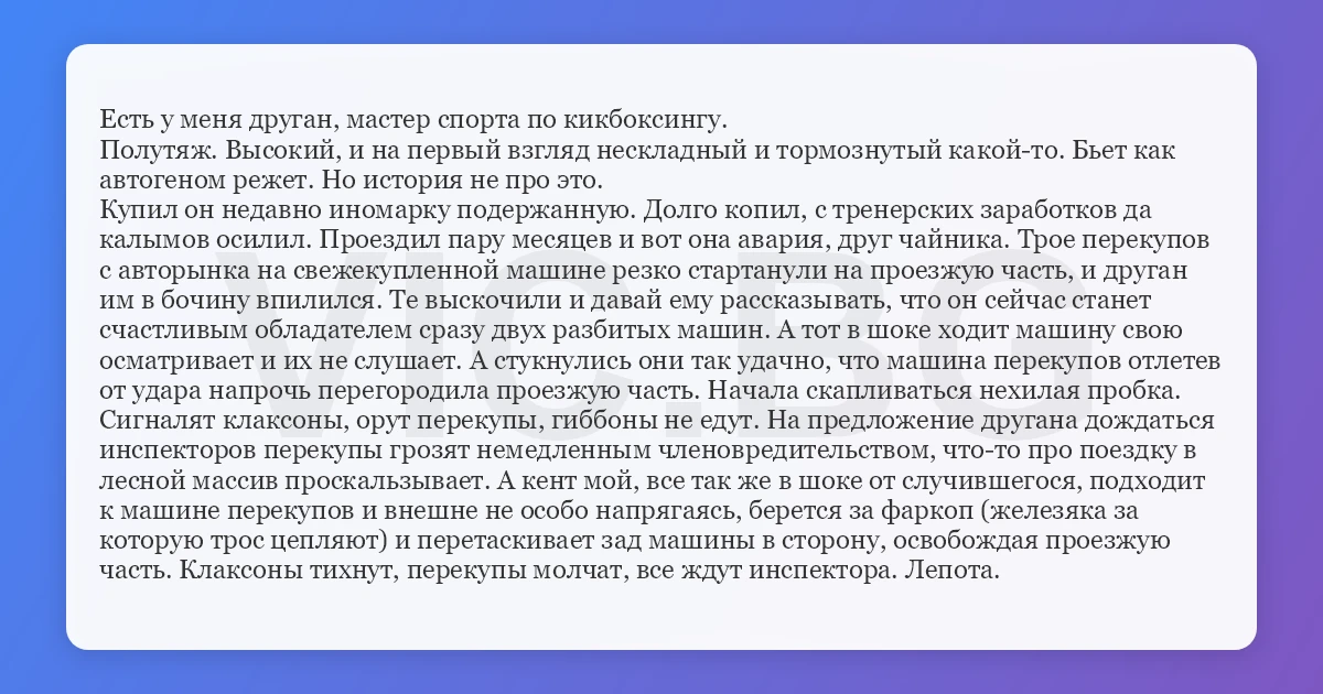 Есть у меня друган, мастер спорта по кикбоксингу. Полутяж. Высокий, и на первый взгляд нескладный и тормознутый какой-то. Бьет как автогеном режет. Но история не про это. Купил он недавно иномарку подержанную. Долго копил, с тренерских заработков да калымов осилил. Проездил пару месяцев и вот она авария, друг чайника. Трое перекупов с авторынка на свежекупленной машине резко стартанули на проезжую часть, и друган им в бочину впилился. Те выскочили и давай ему рассказывать, что он сейчас станет счастливым обладателем сразу двух разбитых машин. А тот в шоке ходит машину свою осматривает и их не слушает. А стукнулись они так удачно, что машина перекупов отлетев от удара напрочь перегородила проезжую часть. Начала скапливаться нехилая пробка. Сигналят клаксоны, орут перекупы, гиббоны не едут. На предложение другана дождаться инспекторов перекупы грозят немедленным членовредительством, что-то про поездку в лесной массив проскальзывает. А кент мой, все так же в шоке от случившегося, подходит к машине перекупов и внешне не особо напрягаясь, берется за фаркоп (железяка за которую трос цепляют) и перетаскивает зад машины в сторону, освобождая проезжую часть. Клаксоны тихнут, перекупы молчат, все ждут инспектора. Лепота.