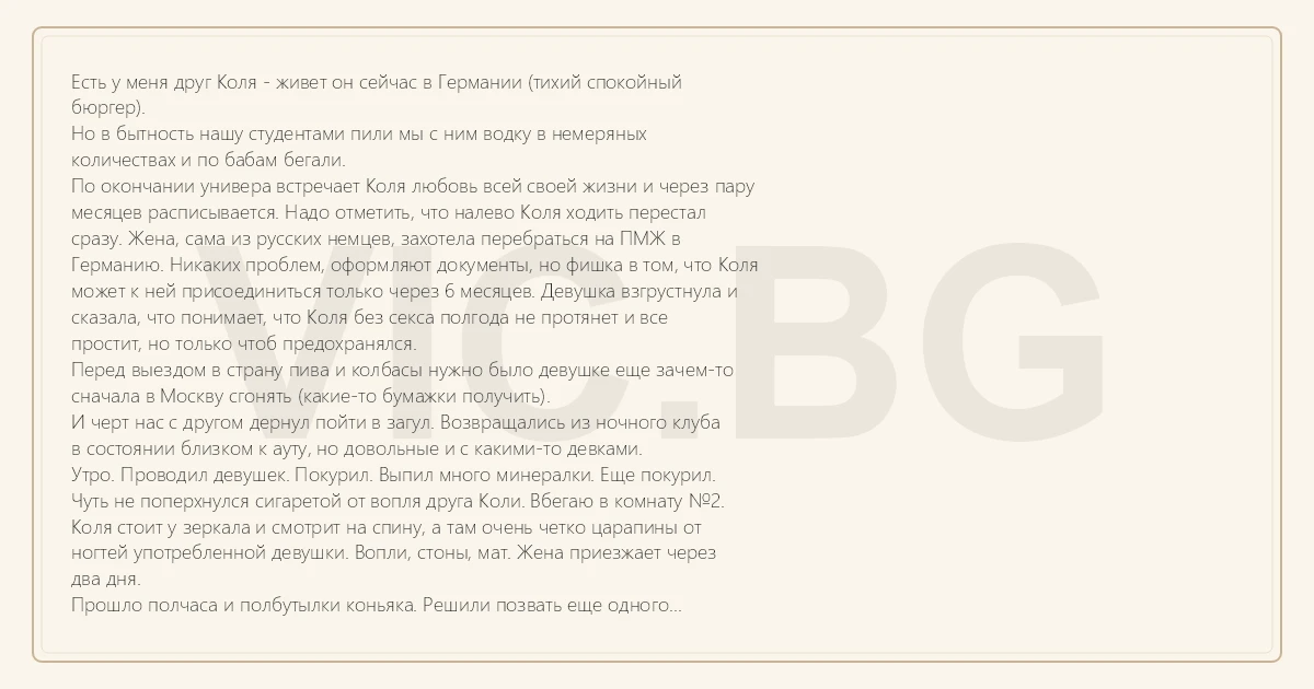 Есть у меня друг Коля - живет он сейчас в Германии (тихий спокойный бюргер). Но в бытность нашу студентами пили мы с ним водку в немеряных количествах и по бабам бегали. По окончании универа встречает Коля любовь всей своей жизни и через пару месяцев расписывается. Надо отметить, что налево Коля ходить перестал сразу. Жена, сама из русских немцев, захотела перебраться на ПМЖ в Германию. Никаких проблем, оформляют документы, но фишка в том, что Коля может к ней присоединиться только через 6 месяцев. Девушка взгрустнула и сказала, что понимает, что Коля без cekca полгода не протянет и все простит, но только чтоб предохранялся. Перед выездом в страну пива и колбасы нужно было девушке еще зачем-то сначала в Москву сгонять (какие-то бумажки получить). И черт нас с другом дернул пойти в загул. Возвращались из ночного клуба в состоянии близком к ауту, но довольные и с какими-то девками. Утро. Проводил девушек. Покурил. Выпил много минералки. Еще покурил. Чуть не поперхнулся сигаретой от вопля друга Коли. Вбегаю в комнату №2. Коля стоит у зеркала и смотрит на спину, а там очень четко царапины от ногтей употребленной девушки. Вопли, стоны, мат. Жена приезжает через два дня. Прошло полчаса и полбутылки коньяка. Решили позвать еще одного товарища - типа думать лучше втроем. Спустя еще пару часов приняли судьбоносное решение - спину ошкурить наждачкой, пожертвовать футболкой (вымазать в крови и пыли) - вроде как упал в подъезде, оцарапал всю спину. Еще и пожалеют. Коля, в теории воспринимавший идею как здравую, увидев наждачку заявил, что коньяк в таком деле не помощник - надо водки, много водки и обезболивающее. Влили водки, дали таблетки (сами тоже выпили для храборости, чай не живодеры). Потом привязали Колю к радиатору батареи и начали. Описывать не буду. Квартира была Колина и его сестра решила навестить любимого брата, оставшегося без женской опеки и ласки. Заходит внутрь, а там картина: привязанный Коля в крови и два лучших друга его наждачкой по спине гладят. Сестра ох%ела! Прошло два дня, приехала жена: охи, ахи. Вчера Коля звонил - зашел у них с женой разговор про Россию. Вспомнили его спину. А жена ласково так говорит: "Да все я тогда поняла. Но представила как тебе больно было и пожалела. Даже скандала не стала устраивать. Люблю потому что." Вот так. Бабы не все дуры!