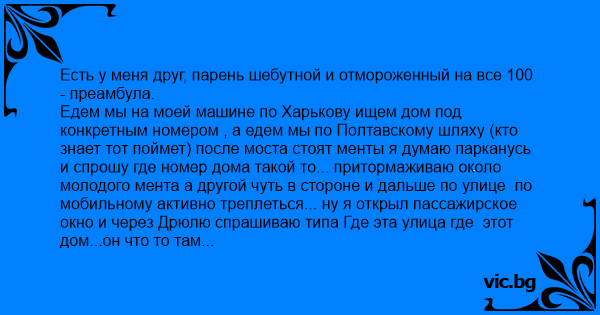 Едем мы на моей машине по Харькову ищем дом под конкретным номером , а едем мы по Полтавскому шляху (кто знает тот поймет) после моста стоят менты я думаю парканусь и спрошу где номер дома такой то... притормаживаю около молодого мента а другой чуть в стороне и дальше по улице по мобильному активно треплеться... ну я открыл пассажирское окно и через Дрюлю спрашиваю типа Где эта улица где этот дом...он что то там пытается объяснить, но съезжает, что стрАршой лучше знает...тот который по телефону п...дит... мы докатываемся до него и я не успеваю спросить так мой друган выдает в окно - слыш капитан у молодого с сотки сдачи нет гони полтиник, тот по карманам посмотрел не переставая говорить достал полтинник, отстегнул, Дрюля взял и мы поехали... потом неделю объезжал эту дорогу...