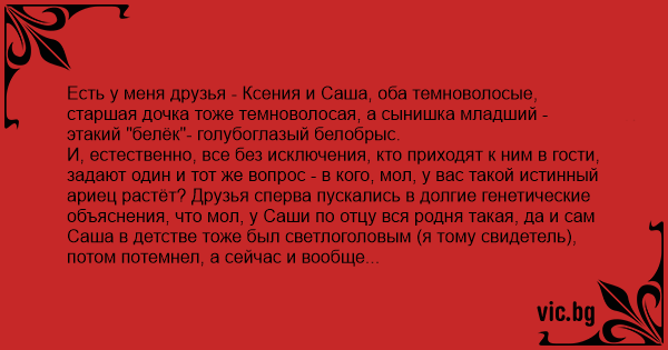 Есть у меня друзья - Ксения и Саша, оба темноволосые, старшая дочка тоже темноволосая, а сынишка младший - этакий "белёк"- голубоглазый белобрыс.