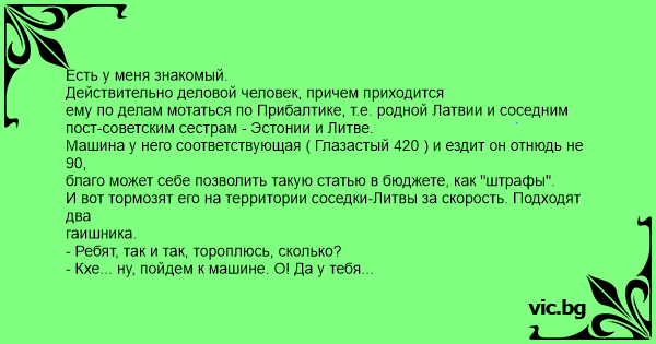 Есть у меня знакомый. Действительно деловой человек, причем приходится ему по делам мотаться по Прибалтике, т.е. родной Латвии и соседним пост-советским сестрам - Эстонии и Литве. Машина у него соответствующая ( Глазастый 420 ) и ездит он отнюдь не 90, благо может себе позволить такую статью в бюджете, как "штрафы". И вот тормозят его на территории соседки-Литвы за скорость. Подходят два гаишника. - Ребят, так и так, тороплюсь, сколько? - Кхе... ну, пойдем к машине. О! Да у тебя стекла затемненные! // В Литве - запрещено - Заводское, извиняйте - не катит. - Ну-ка приспусти окошко... пленка, где-ж заводское! - Таким брал, честное слово! Да и у нас можно... - А у нас - нельзя... ну, пойдем в машину. Сели. - Сколько? - Сто (литов) за скорость, сто пятьдесят за стекла. - Я выбираю скорость, - говорит знакомый и кладет сто литов :))) Гаишники выпадают в осадок, долго смеются и отпускают знакомого.