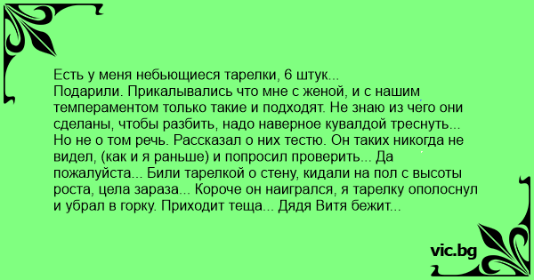 Подарили. Прикалывались что мне с женой, и с нашим темпераментом только такие и подходят. Не знаю из чего они сделаны, чтобы разбить, надо наверное кувалдой треснуть... Но не о том речь. Рассказал о них тестю. Он таких никогда не видел, (как и я раньше) и попросил проверить... Да пожалуйста... Били тарелкой о стену, кидали на пол с высоты роста, цела зараза... Короче он наигрался, я тарелку ополоснул и убрал в горку. Приходит теща... Дядя Витя бежит как ребенок, Света, смотри что покажу... Бежит на кухню, хватает тарелку, выбегает в прихожую и хрясь на пол... А до меня в последний момент дошло, что тарелку он обычную схватил, очень похожей расцветки...