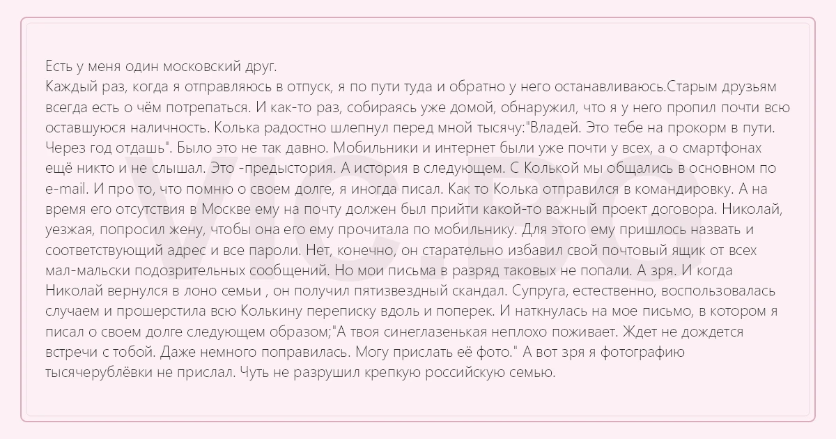 Каждый раз, когда я отправляюсь в отпуск, я по пути туда и обратно у него останавливаюсь.Старым друзьям всегда есть о чём потрепаться. И как-то раз, собираясь уже домой, обнаружил, что я у него пропил почти всю оставшуюся наличность. Колька радостно шлепнул перед мной тысячу:"Владей. Это тебе на прокорм в пути. Через год отдашь". Было это не так давно. Мобильники и интернет были уже почти у всех, а о смартфонах ещё никто и не слышал. Это -предыстория. А история в следующем. С Колькой мы общались в основном по e-mail. И про то, что помню о своем долге, я иногда писал. Как то Колька отправился в командировку. А на время его отсутствия в Москве ему на почту должен был прийти какой-то важный проект договора. Николай, уезжая, попросил жену, чтобы она его ему прочитала по мобильнику. Для этого ему пришлось назвать и соответствующий адрес и все пароли. Нет, конечно, он старательно избавил свой почтовый ящик от всех мал-мальски подозрительных сообщений. Но мои письма в разряд таковых не попали. А зря. И когда Николай вернулся в лоно семьи , он получил пятизвездный скандал. Супруга, естественно, воспользовалась случаем и прошерстила всю Колькину переписку вдоль и поперек. И наткнулась на мое письмо, в котором я писал о своем долге следующем образом;"А твоя синеглазенькая неплохо поживает. Ждет не дождется встречи с тобой. Даже немного поправилась. Могу прислать её фото." А вот зря я фотографию тысячерублёвки не прислал. Чуть не разрушил крепкую российскую семью.