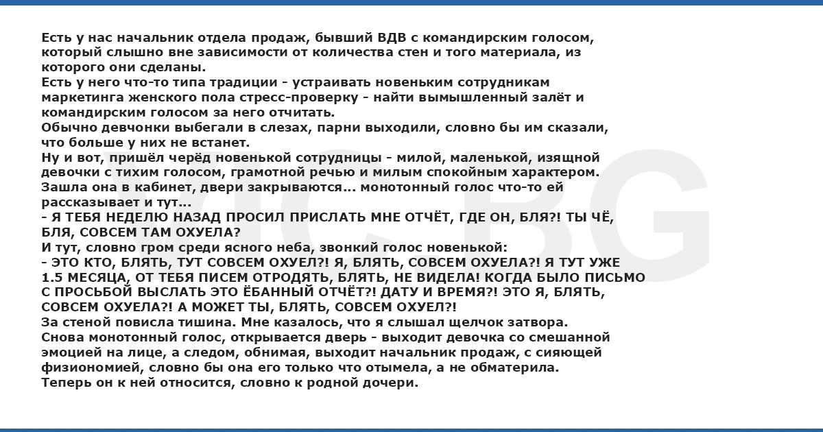 Есть у нас начальник отдела продаж, бывший ВДВ с командирским голосом, который слышно вне зависимости от количества стен и того материала, из которого они сделаны. Есть у него что-то типа традиции - устраивать новеньким сотрудникам маркетинга женского пола стресс-проверку - найти вымышленный залёт и командирским голосом за него отчитать. Обычно девчонки выбегали в слезах, парни выходили, словно бы им сказали, что больше у них не встанет. Ну и вот, пришёл черёд новенькой сотрудницы - милой, маленькой, изящной девочки с тихим голосом, грамотной речью и милым спокойным характером. Зашла она в кабинет, двери закрываются... монотонный голос что-то ей рассказывает и тут... - Я ТЕБЯ НЕДЕЛЮ НАЗАД ПРОСИЛ ПРИСЛАТЬ МНЕ ОТЧЁТ, ГДЕ ОН, БЛЯ?! ТЫ ЧЁ, БЛЯ, СОВСЕМ ТАМ ОХУЕЛА? И тут, словно гром среди ясного неба, звонкий голос новенькой: - ЭТО КТО, БЛЯTЬ, ТУТ СОВСЕМ OХYEЛ?! Я, БЛЯTЬ, СОВСЕМ ОХУЕЛА?! Я ТУТ УЖЕ 1.5 МЕСЯЦА, ОТ ТЕБЯ ПИСЕМ ОТРОДЯТЬ, БЛЯTЬ, НЕ ВИДЕЛА! КОГДА БЫЛО ПИСЬМО С ПРОСЬБОЙ ВЫСЛАТЬ ЭТО ЁБАННЫЙ ОТЧЁТ?! ДАТУ И ВРЕМЯ?! ЭТО Я, БЛЯTЬ, СОВСЕМ ОХУЕЛА?! А МОЖЕТ ТЫ, БЛЯTЬ, СОВСЕМ OХYEЛ?! За стеной повисла тишина. Мне казалось, что я слышал щелчок затвора. Снова монотонный голос, открывается дверь - выходит девочка со смешанной эмоцией на лице, а следом, обнимая, выходит начальник продаж, с сияющей физиономией, словно бы она его только что отымела, а не обматерила. Теперь он к ней относится, словно к родной дочери.