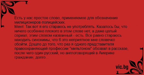 Мент. Так вот я его стараюсь не употреблять. Казалось бы, что ничего особенно плохого в этом слове нет, а даже целый сериал, этим словом названный - есть. Все равно стараюсь находить синонимы, что б это неприятное мне словечко обойти. Дошло до того, что раз я одного представителя правоохраняющей профессии "мильтоном" обозвал в рассказе, после чего один русский, но англоговорящий в Америке гражданин, долго допытывался, причем тут классическая английская поэзия и Мильтон, который Джон. Пришлось объяснять.