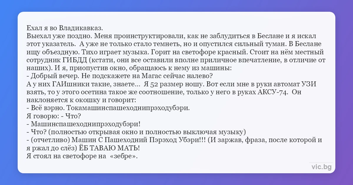 Ехал я во Владикавказ. Выехал уже поздно. Меня проинструктировали, как не заблудиться в Беслане и я искал этот указатель. А уже не только стало темнеть, но и опустился сильный туман. В Беслане ищу объездную. Тихо играет музыка. Горит на светофоре красный. Стоит на нём местный сотрудник ГИБДД (кстати, они все оставили вполне приличное впечатление, в отличие от наших). И я, приопустив окно, обращаюсь к нему из машины: - Добрый вечер. Не подскажете на Магас сейчас налево? А у них ГАИшники такие, знаете… Я 52 размер ношу. Вот если мне в руки автомат УЗИ взять, то у этого осетина такое же соотношение, только у него в руках АКСУ-74. Он наклоняется к окошку и говорит: - Всё вэрно. Токамашинспашеходнипрэходубэри. Я говорю: - Что? - Машинспашеходнипрэходубэри! - Что? (полностью открывая окно и полностью выключая музыку) - (отчетливо) Машин С Пашеходний Пэрэход Убэри!!! (И заржав, фраза, после которой и я ржал до слёз) ЁБ ТАВАЮ МАТЬ! Я стоял на светофоре на «зебре».