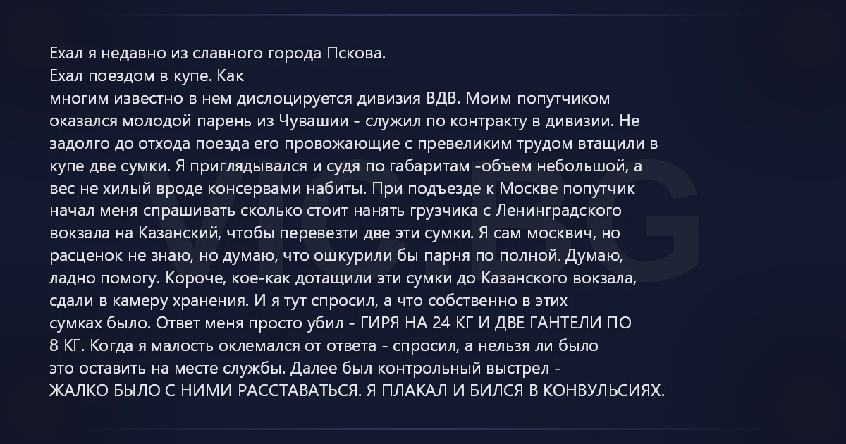 Ехал я недавно из славного города Пскова. Ехал поездом в купе. Как многим известно в нем дислоцируется дивизия ВДВ. Моим попутчиком оказался молодой парень из Чувашии - служил по контракту в дивизии. Не задолго до отхода поезда его провожающие с превеликим трудом втащили в купе две сумки. Я приглядывался и судя по габаритам -объем небольшой, а вес не хилый вроде консервами набиты. При подъезде к Москве попутчик начал меня спрашивать сколько стоит нанять грузчика с Ленинградского вокзала на Казанский, чтобы перевезти две эти сумки. Я сам москвич, но расценок не знаю, но думаю, что ошкурили бы парня по полной. Думаю, ладно помогу. Короче, кое-как дотащили эти сумки до Казанского вокзала, сдали в камеру хранения. И я тут спросил, а что собственно в этих сумках было. Ответ меня просто убил - ГИРЯ НА 24 КГ И ДВЕ ГАНТЕЛИ ПО 8 КГ. Когда я малость оклемался от ответа - спросил, а нельзя ли было это оставить на месте службы. Далее был контрольный выстрел - ЖАЛКО БЫЛО С НИМИ РАССТАВАТЬСЯ. Я ПЛАКАЛ И БИЛСЯ В КОНВУЛЬСИЯХ.