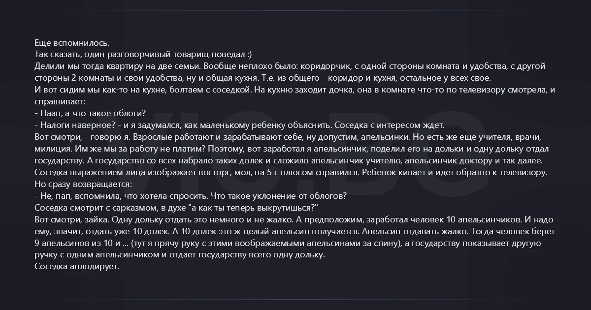 Еще вспомнилось. Так сказать, один разговорчивый товарищ поведал :) Делили мы тогда квартиру на две семьи. Вообще неплохо было: коридорчик, с одной стороны комната и удобства, с другой стороны 2 комнаты и свои удобства, ну и общая кухня. Т.е. из общего - коридор и кухня, остальное у всех свое. И вот сидим мы как-то на кухне, болтаем с соседкой. На кухню заходит дочка, она в комнате что-то по телевизору смотрела, и спрашивает: - Паап, а что такое облоги? - Налоги наверное? - и я задумался, как маленькому ребенку объяснить. Соседка с интересом ждет. Вот смотри, - говорю я. Взрослые работают и зарабатывают себе, ну допустим, апельсинки. Но есть же еще учителя, врачи, милиция. Им же мы за работу не платим? Поэтому, вот заработал я апельсинчик, поделил его на дольки и одну дольку отдал государству. А государство со всех набрало таких долек и сложило апельсинчик учителю, апельсинчик доктору и так далее. Соседка выражением лица изображает восторг, мол, на 5 с плюсом справился. Ребенок кивает и идет обратно к телевизору. Но сразу возвращается: - Не, пап, вспомнила, что хотела спросить. Что такое уклонение от облогов? Соседка смотрит с сарказмом, в духе "а как ты теперь выкрутишься?" Вот смотри, зайка. Одну дольку отдать это немного и не жалко. А предположим, заработал человек 10 апельсинчиков. И надо ему, значит, отдать уже 10 долек. А 10 долек это ж целый апельсин получается. Апельсин отдавать жалко. Тогда человек берет 9 апельсинов из 10 и ... (тут я прячу руку с этими воображаемыми апельсинами за спину), а государству показывает другую ручку с одним апельсинчиком и отдает государству всего одну дольку. Соседка аплодирует.