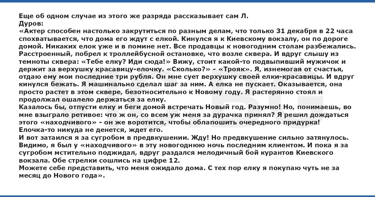 Еще об одном случае из этого же разряда рассказывает сам Л. Дуров: «Актер способен настолько закрутиться по разным делам, что только 31 декабря в 22 часа спохватывается, что дома его ждут с елкой. Кинулся я к Киевскому вокзалу, он по дороге домой. Никаких елок уже и в помине нет. Все продавцы к новогодним столам разбежались. Расстроенный, побрел к троллейбусной остановке, что возле сквера. И вдруг слышу из темноты сквера: «Тебе елку? Иди сюда!» Вижу, стоит какой-то подвыпивший мужичок и держит за верхушку красавицу-елочку. «Сколько?» - «Трояк». Я, изнемогая от счастья, отдаю ему мои последние три рубля. Он мне сует верхушку своей елки-красавицы. И вдруг кинулся бежать. Я машинально сделал шаг за ним. А елка не пускает. Оказывается, она просто растет в этом сквере, безотносительно к Новому году. Я растерянно стоял и продолжал ошалело держаться за елку. Казалось бы, отпусти елку и беги домой встречать Новый год. Разумно! Но, понимаешь, во мне взыграло ретивое: что ж он, со всем уж меня за дурачка принял? Я решил дождаться этого «находчивого» - он же воротится, чтобы облапошить очередного придурка! Елочка-то никуда не денется, ждет его. И вот затаился я за сугробом в предвкушении. Жду! Но предвкушение сильно затянулось. Видимо, я был у «находчивого» в эту новогоднюю ночь последним клиентом. И пока я за сугробом мстительно поджидал, вдруг раздался мелодичный бой курантов Киевского вокзала. Обе стрелки сошлись на цифре 12. Можете себе представить, что меня ожидало дома. С тех пор елку я покупаю чуть не за месяц до Нового года».