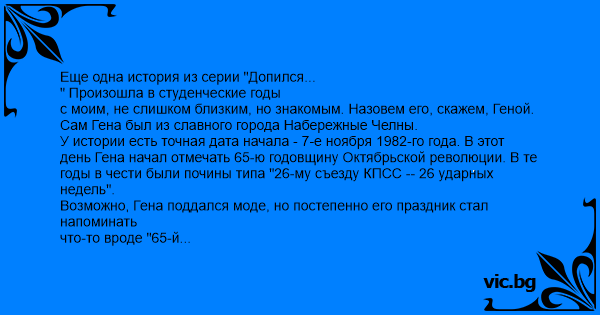 Еще одна история из серии "Допился... " Произошла в студенческие годы с моим, не слишком близким, но знакомым. Назовем его, скажем, Геной. Сам Гена был из славного города Набережные Челны. У истории есть точная дата начала - 7-е ноября 1982-го года. В этот день Гена начал отмечать 65-ю годовщину Октябрьской революции. В те годы в чести были почины типа "26-му съезду КПСС -- 26 ударных недель". Возможно, Гена поддался моде, но постепенно его праздник стал напоминать что-то вроде "65-й годовщине - 65 попоек". Он полностью утерял связь с внешним миром (кроме учреждений торговли, где можно было приобрести огненную воду и закусь), и не знал, что творится в вокруг. А там-таки кое-что творилось. Во-первых, скончался генеральный секретарь ЦК КПСС Л.И.Брежнев. Во-вторых, в честь этого события в стране было решено увековечить память Леонида Ильича. Среди "счастливчиков", кроме московского района Черемушки и ледокола "Арктика", оказался и родной город Гены. Наконец, в-третьих, родные Гены, жившие в бывших Набережных Челнах, обеспокоились отстутствием писем от московского студента и захотели услышать его голос. Для чего, естессно, пошли на почту и заказали телефонный разговор с Геной. Еще раз подчеркиваю, что Гена обо всем этом был ни сном ни духом. В последующей сцене предлагаю вам представить себя на месте нашего героя: на пятьдесят-какой-то день праздника он просыпается от стука в дверь. Вахтер общежития вручает Гене телеграмму следующего содержания: "Вы приглашаетесь в 19-00 на переговоры с Брежневым тчк"... Единственное, что смог вымолвить Гена в ближайший час после этого: - Все, бля. Бросаю пить.