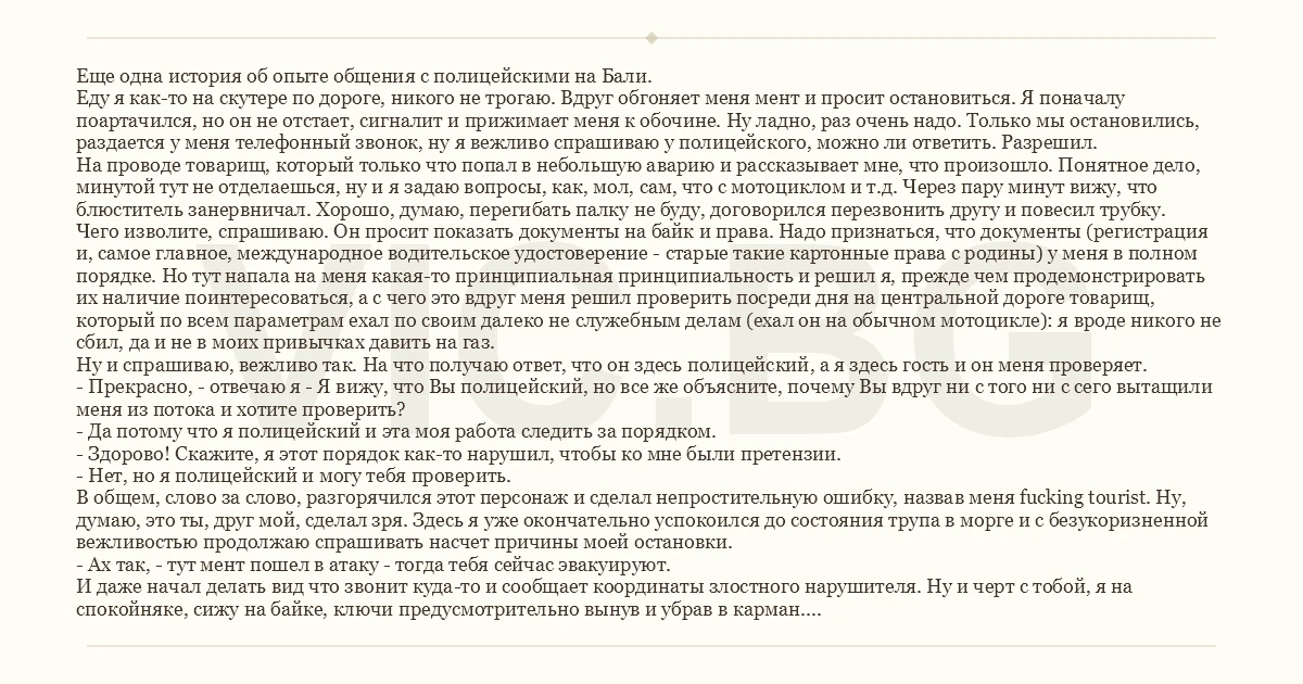 Еще одна история об опыте общения с полицейскими на Бали. Еду я как-то на скутере по дороге, никого не трогаю. Вдруг обгоняет меня мент и просит остановиться. Я поначалу поартачился, но он не отстает, сигналит и прижимает меня к обочине. Ну ладно, раз очень надо. Только мы остановились, раздается у меня телефонный звонок, ну я вежливо спрашиваю у полицейского, можно ли ответить. Разрешил. На проводе товарищ, который только что попал в небольшую аварию и рассказывает мне, что произошло. Понятное дело, минутой тут не отделаешься, ну и я задаю вопросы, как, мол, сам, что с мотоциклом и т.д. Через пару минут вижу, что блюститель занервничал. Хорошо, думаю, перегибать палку не буду, договорился перезвонить другу и повесил трубку. Чего изволите, спрашиваю. Он просит показать документы на байк и права. Надо признаться, что документы (регистрация и, самое главное, международное водительское удостоверение - старые такие картонные права с родины) у меня в полном порядке. Но тут напала на меня какая-то принципиальная принципиальность и решил я, прежде чем продемонстрировать их наличие поинтересоваться, а с чего это вдруг меня решил проверить посреди дня на центральной дороге товарищ, который по всем параметрам ехал по своим далеко не служебным делам (ехал он на обычном мотоцикле): я вроде никого не сбил, да и не в моих привычках давить на газ. Ну и спрашиваю, вежливо так. На что получаю ответ, что он здесь полицейский, а я здесь гость и он меня проверяет. - Прекрасно, - отвечаю я - Я вижу, что Вы полицейский, но все же объясните, почему Вы вдруг ни с того ни с сего вытащили меня из потока и хотите проверить? - Да потому что я полицейский и эта моя работа следить за порядком. - Здорово! Скажите, я этот порядок как-то нарушил, чтобы ко мне были претензии. - Нет, но я полицейский и могу тебя проверить. В общем, слово за слово, разгорячился этот персонаж и сделал непростительную ошибку, назвав меня fuскing tourist. Ну, думаю, это ты, друг мой, сделал зря. Здесь я уже окончательно успокоился до состояния трупа в морге и с безукоризненной вежливостью продолжаю спрашивать насчет причины моей остановки. - Ах так, - тут мент пошел в атаку - тогда тебя сейчас эвакуируют. И даже начал делать вид что звонит куда-то и сообщает координаты злостного нарушителя. Ну и черт с тобой, я на спокойняке, сижу на байке, ключи предусмотрительно вынув и убрав в карман. Постояли мы так минут пять: он, бросая на меня злобные взгляды, я - вежливо улыбаясь. Он еще раз позвонил куда-то, я еще раз спросил насчет причины остановки. Ответа не дождался, как, впрочем, и не дождался эвакуатора. Вместо этого, полицейский направился к своему байку и уже оттуда напугал ждущим меня впереди полицейским постом (а он там действительно есть), на котором меня сейчас остановят и уже поговорят по-пацански. С этими словами он сел на мотоцикл и покатил, а я потихонечку за ним. И было бы у этой истории еще какое-нибудь нелепое продолжение, если бы не доезжая до поста, мой заботливый полицейский не срулил бы на второстепенную дорогу и не растворился в пыльной балийской дали... К чему это, собственно, я? Может они и не нужны, эти лишние заморочки, но в целом хочется верить в знаменитую истину персонажа Сергея Бодрова: сила, брат, в правде.