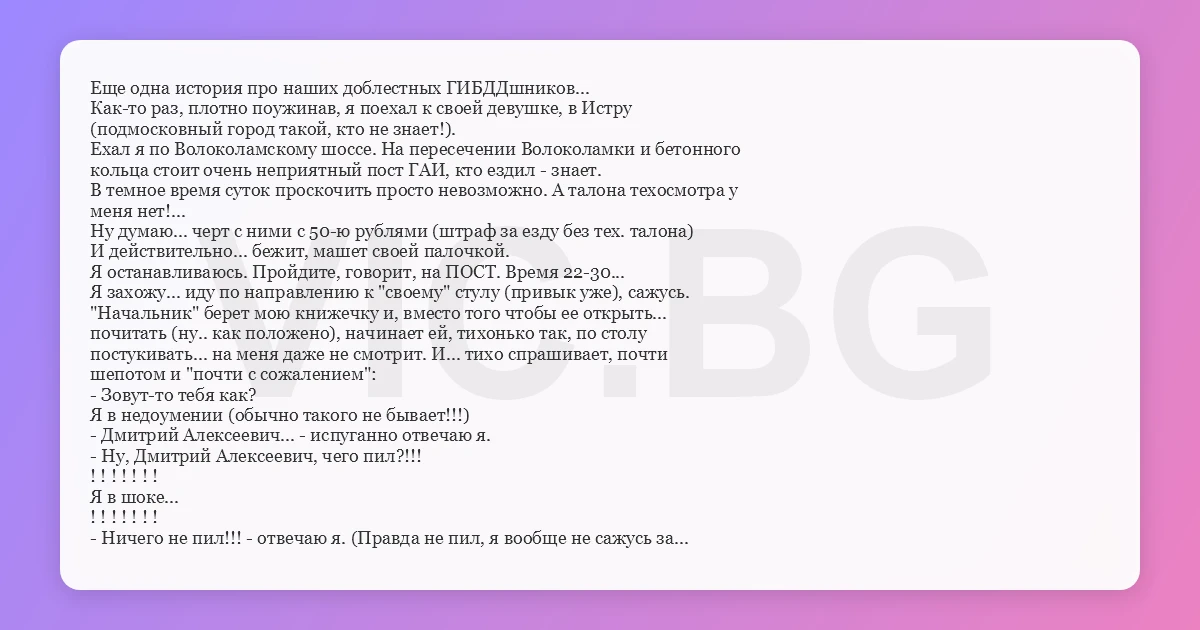 Еще одна история про наших доблестных ГИБДДшников... Как-то раз, плотно поужинав, я поехал к своей девушке, в Истру (подмосковный город такой, кто не знает!). Ехал я по Волоколамскому шоссе. На пересечении Волоколамки и бетонного кольца стоит очень неприятный пост ГАИ, кто ездил - знает. В темное время суток проскочить просто невозможно. А талона техосмотра у меня нет!... Ну думаю... черт с ними с 50-ю рублями (штраф за езду без тех. талона) И действительно... бежит, машет своей палочкой. Я останавливаюсь. Пройдите, говорит, на ПОСТ. Время 22-30... Я захожу... иду по направлению к "своему" стулу (привык уже), сажусь. "Начальник" берет мою книжечку и, вместо того чтобы ее открыть... почитать (ну.. как положено), начинает ей, тихонько так, по столу постукивать... на меня даже не смотрит. И... тихо спрашивает, почти шепотом и "почти с сожалением": - Зовут-то тебя как? Я в недоумении (обычно такого не бывает!!!) - Дмитрий Алексеевич... - испуганно отвечаю я. - Ну, Дмитрий Алексеевич, чего пил?!!! ! ! ! ! ! ! ! Я в шоке... ! ! ! ! ! ! ! - Ничего не пил!!! - отвечаю я. (Правда не пил, я вообще не сажусь за руль, выпив даже бутылку пива!) - Нет, - говорит - Дмитрий Алексеевич, чего-то пили (небрежно так, как будто я ему вру...), ну-ка, дыхните!! И подставляет мне свой нос.... Ну я дыхнул... Смотрю, его как-то передернуло всего.... странно думаю... - НЕТ, ПИЛИ!!! - обозлившись, говорит он. - Да НЕ ПИЛ Я!!! - уже раздраженно говорю ему я... он начинает сомневаться... - Дыхните еще раз, посильнее.... Ну я и дыхнул... продолжительно так... мощно!!! ............ Минутная пауза.......... На лице "начальника" никаких изменений... застыл. Потом смотрю, а его глаза (как в "том и джери") зеленью заполняются... медленно так... снизу вверх. Тут я сам испугался... начинаю перебирать в памяти весь сегодняшний день и вспоминаю.... Я же на ужин лука сожрал, слоновью дозу... "Начальник" все еще в застывшем положении.... глаза темно зеленые... левую щеку начинает слегка поддергивать... - ААААА!!!! вспомнил, - радостно говорю я... ну и рассказал ему про лук на ужин... Вся его зелень из глаз исчезла (как будто вылилась)... лицо, все так же находившееся в застывшем положении, начинает краснеть... потом багроветь и сильно трястись (ну лука правда было очень много)... Из ушей со свистом повалил пар.... Он как ВСКОЧИТ!!! Как швырнет в меня документами... и как ЗАОРЕТ!!!: - ПОШЕЛ ВОН ОТСЮДА......... Ты мне всю будку провонял!!! ------ Вот так, документы он мои так и не открыл.. Обошлось без штрафа.