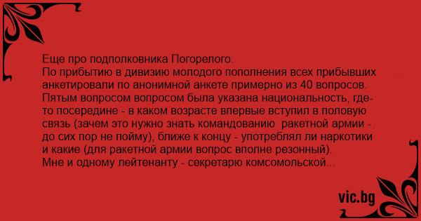 Мне и одному лейтенанту - секретарю комсомольской организации полка, Погорелый поручил произвести обобщение анкет и подготовить сводные данные. После обработки анкет пятый вопрос в обобщенной справке выглядел так (цифры указываю с потолка, чтобы не разгласить военную тайну):