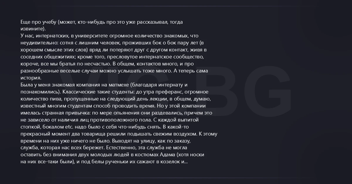 Еще про учебу (может, кто-нибудь про это уже рассказывал, тогда извините). У нас, интернатских, в университете огромное количество знакомых, что неудивительно: сотня с лишним человек, проживших бок о бок пару лет (в хорошем смысле этих слов) вряд ли потеряют друг с другом контакт, живя в соседних общежитиях; кроме того, пресловутое интернатское сообщество, короче, все мы братья по несчастью. В общем, контактов много, и про разнообразные веселые случаи можно услышать тоже много. А теперь сама история. Была у меня знакомая компания на матмехе (благодаря интернату и познакомились). Классические такие студенты: до утра преферанс, огромное количество пива, пропущенные на следующий день лекции, в общем, думаю, известный многим студентам способ проводить время. Но у этой компании имелась странная привычка: по мере опьянения они раздевались, причем это не зависело от наличия лиц противоположного пола. С каждой выпитой стопкой, бокалом etc. надо было с себя что-нибудь снять. В какой-то прекрасный момент два товарища решили подышать свежим воздухом. К этому времени на них уже ничего не было. Выходят на улицу, как по заказу, служба, которая нас всех бережет. Естественно, эта служба не могла оставить без внимания двух молодых людей в костюмах Адама (хотя носки на них все-таки были), и под белы рученьки их сажают в козелок и препровождают на следующее место дислокации, то есть в обезьянник. К утру до кого-то более трезвого доходит, два их товарища сидят в аквариуме, в чем мать родила. Экспедиция с одеждой прибыла успешно, и все закончилось благополучно. А учеба здесь вот при чем. Дело происходило в разгар летней сессии, и один из фигурантов рассказа сбежал со своих 15 суток, явился в деканат и объяснил, почему в данный момент не может сдавать экзамены. Ему дали отсрочку со словами: "Да вы сидите, сидите. Потом сдадите".