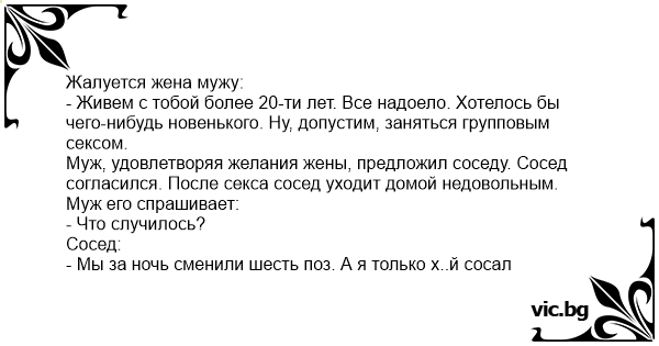 - Живем с тобой более 20-ти лет. Все надоело. Хотелось бы чего-нибудь новенького. Ну, допустим, заняться групповым сексом.