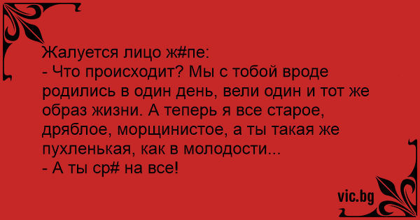 - Что происходит? Мы с тобой вроде родились в один день, вели один и тот же образ жизни. А теперь я все старое, дряблое, морщинистое, а ты такая же пухленькая, как в молодости...