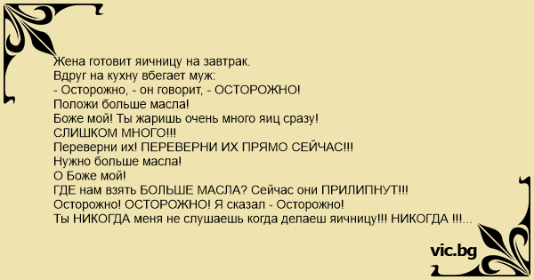 Жена готовит яичницу на завтрак. Вдруг на кухну вбегает муж: - Осторожно, - он говорит, - ОСТОРОЖНО! Положи больше масла! Боже мой! Ты жаришь очень много яиц сразу! СЛИШКОМ МНОГО!!! Переверни их! ПЕРЕВЕРНИ ИХ ПРЯМО СЕЙЧАС!!! Нужно больше масла! О Боже мой! ГДЕ нам взять БОЛЬШЕ МАСЛА? Сейчас они ПРИЛИПНУТ!!! Осторожно! ОСТОРОЖНО! Я сказал - Осторожно! Ты НИКОГДА меня не слушаешь когда делаеш яичницу!!! НИКОГДА !!! Переверни их! БЫСТРО!!! Да ты что, психованная?!! Ты совсем спятила?!! Не забудь посолить! Ты всегда забываешь посолить! Используй СОЛЬ! ИСПОЛЬЗУЙ СОЛЬ! С-О-О-О-О-ЛЬ!!! Жена удивленно смотрит на мужа: - Да что с тобой сегодня?! Ты думаешь я не в состоянии приготовить элементарную яичницу? Муж спокойно объясняет: - Я хотел показать тебе, что Я испытываю, когда вожу машину С ТОБОЙ.