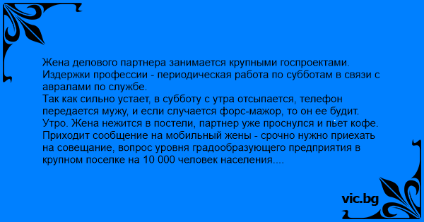 Утро. Жена нежится в постели, партнер уже проснулся и пьет кофе. Приходит сообщение на мобильный жены - срочно нужно приехать на совещание, вопрос уровня градообразующего предприятия в крупном поселке на 10 000 человек населения.