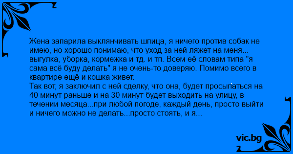 выгулка, уборка, кормежка и тд. и тп. Всем её словам типа "я сама всё буду делать" я не очень-то доверяю. Помимо всего в квартире ещё и кошка живет. Так вот, я заключил с ней сделку, что она, будет просыпаться на 40 минут раньше и на 30 минут будет выходить на улицу, в течении месяца...при любой погоде, каждый день, просто выйти и ничего можно не делать...просто стоять, и я покупаю собаку. Учитывая что мы и так встаём в 6, мне было интересно сможет или нет, или это бремя ляжет на меня.. 3 дня, собака уже не нужна.