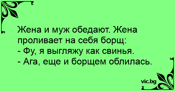 Merge unul cu nevastă-sa să ia cina la restaurant. Farfuria de supă se varsă pe rochia ei cea nouă. Supărată şi aşteptând să fie consolată de soţul romantic, ea zice: - Uite cum arăt, ca o scroafă!...